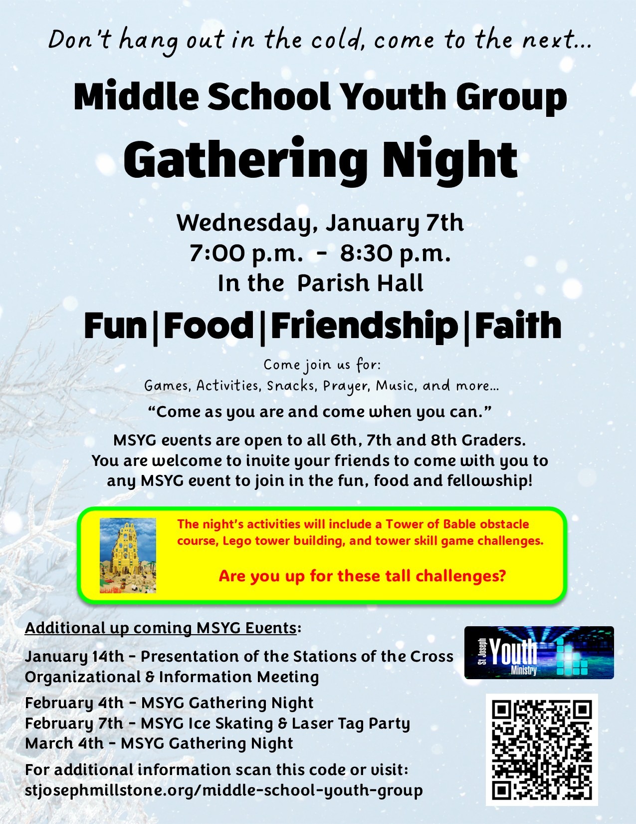MSYG February Gathering Night – The MSYG’s February Gathering Night is on Wednesday, February 4th from 7:00 p.m. to 8:30 p.m. in the Parish Hall. Come and join us for a night of fun, food, friendship, and faith. MSYG Gathering Nights are “Come as you are and come when you can.” Youth are welcome to invite their friends to come and join them in the fun, food and fellowship. Youth participants do not have the be members of St. Joseph Church or even Catholic. All youths in the 6th, 7th and 8th grades are welcome!